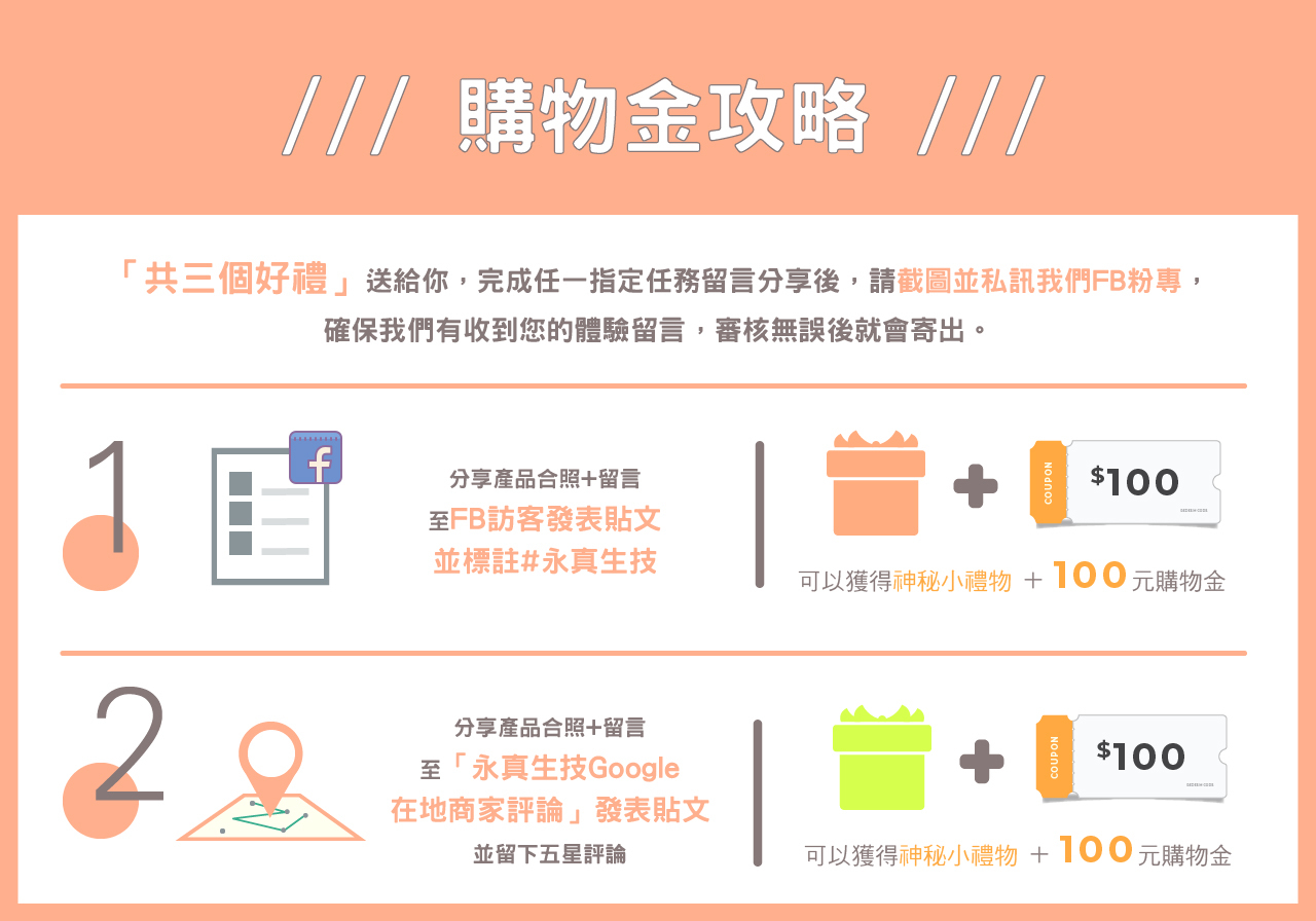 分享照片+心得至FB訪客發表貼文並標記#永真生技,可以獲得神秘小禮物+100元購物金