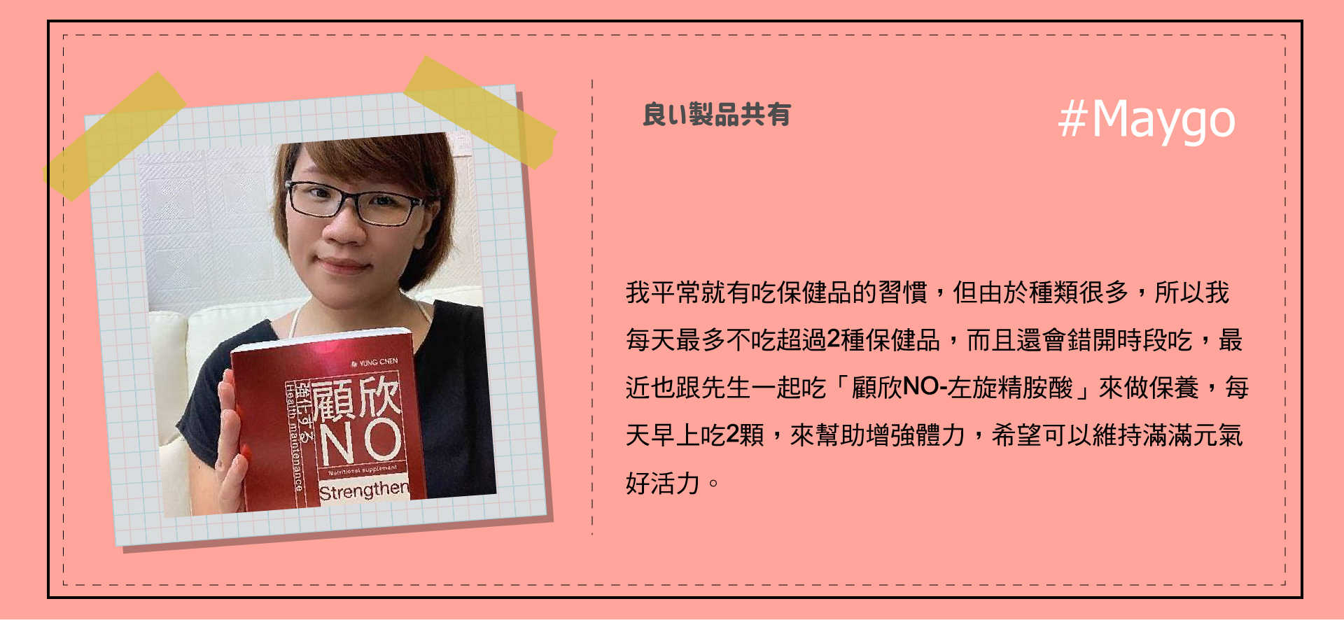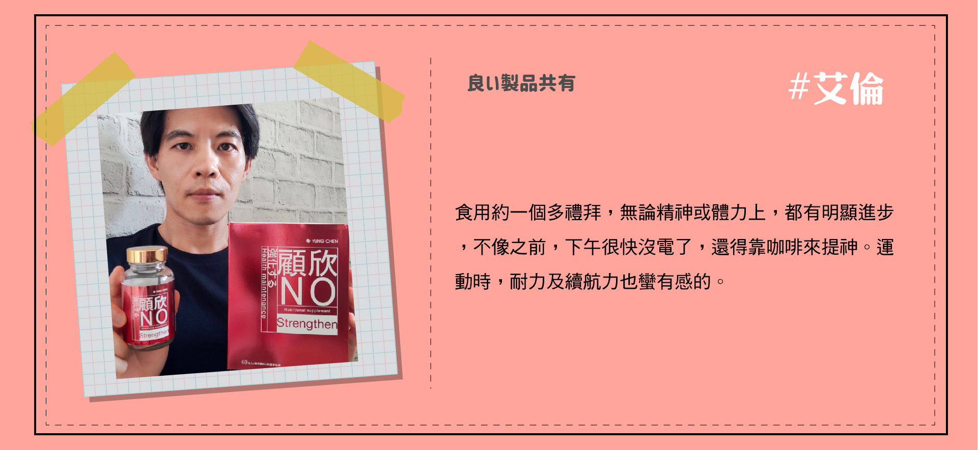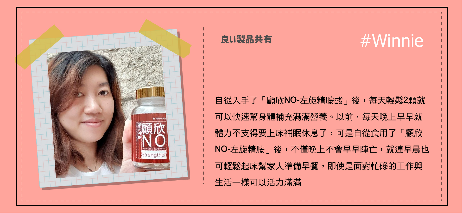 自從食用了「顧欣NO-左旋精胺」後,不僅晚上不會早早陣亡,就連早晨也可輕鬆起床幫家人準備早餐,即使是面對忙碌的工作與生活一樣可以活力滿滿
