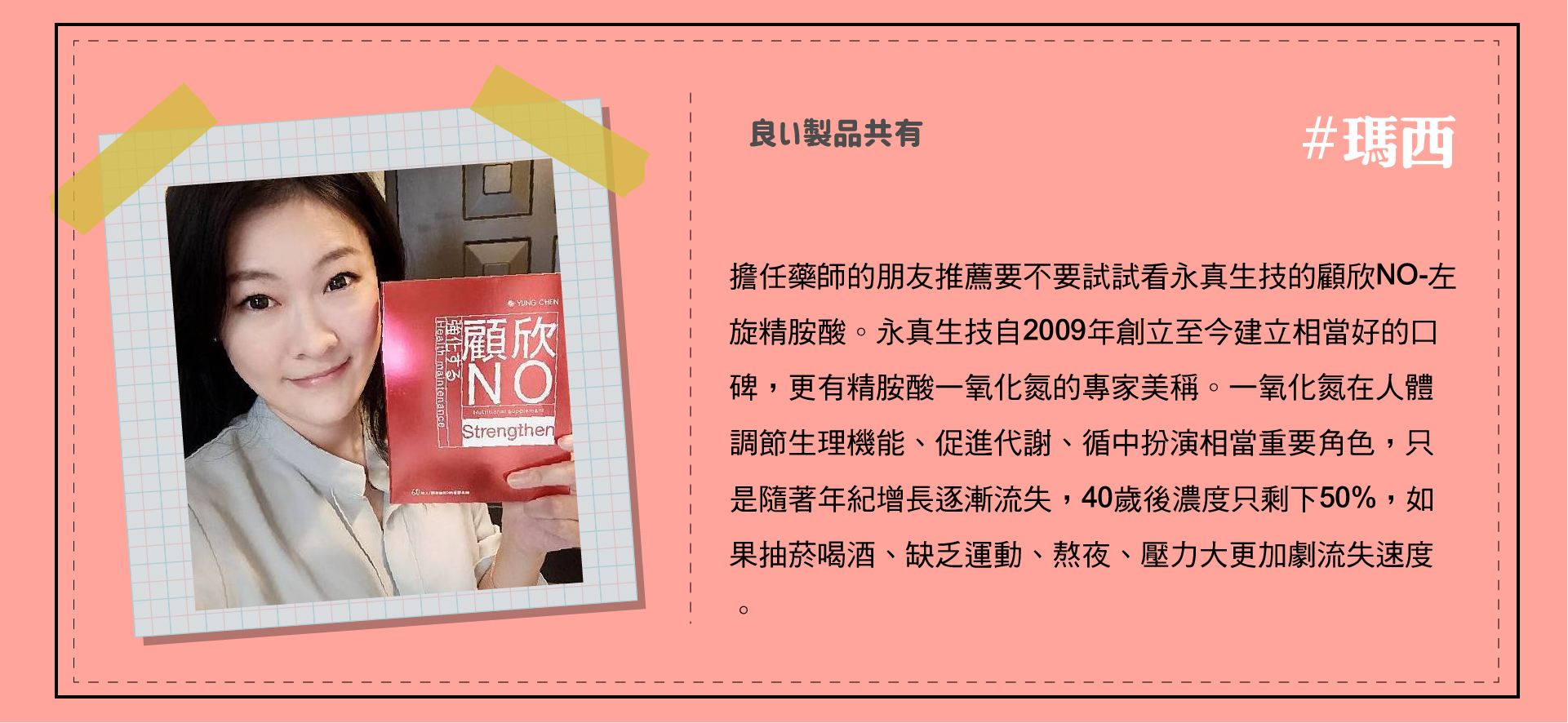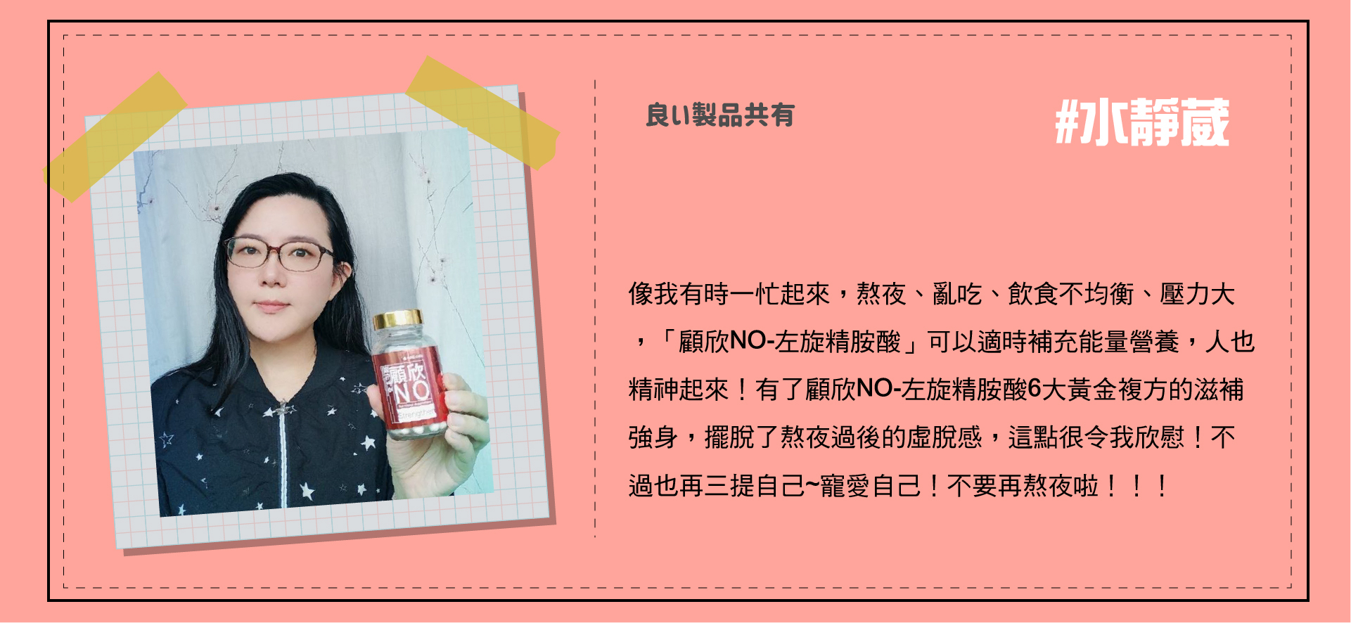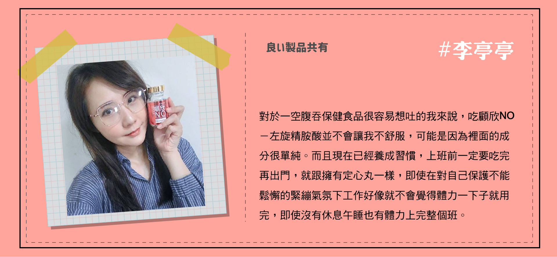 像我有時一忙起來,熬夜、亂吃、飲食不均衡、壓力大,「顧欣NO-左旋精胺酸」可以適時補充能量營養,人也精神起來!