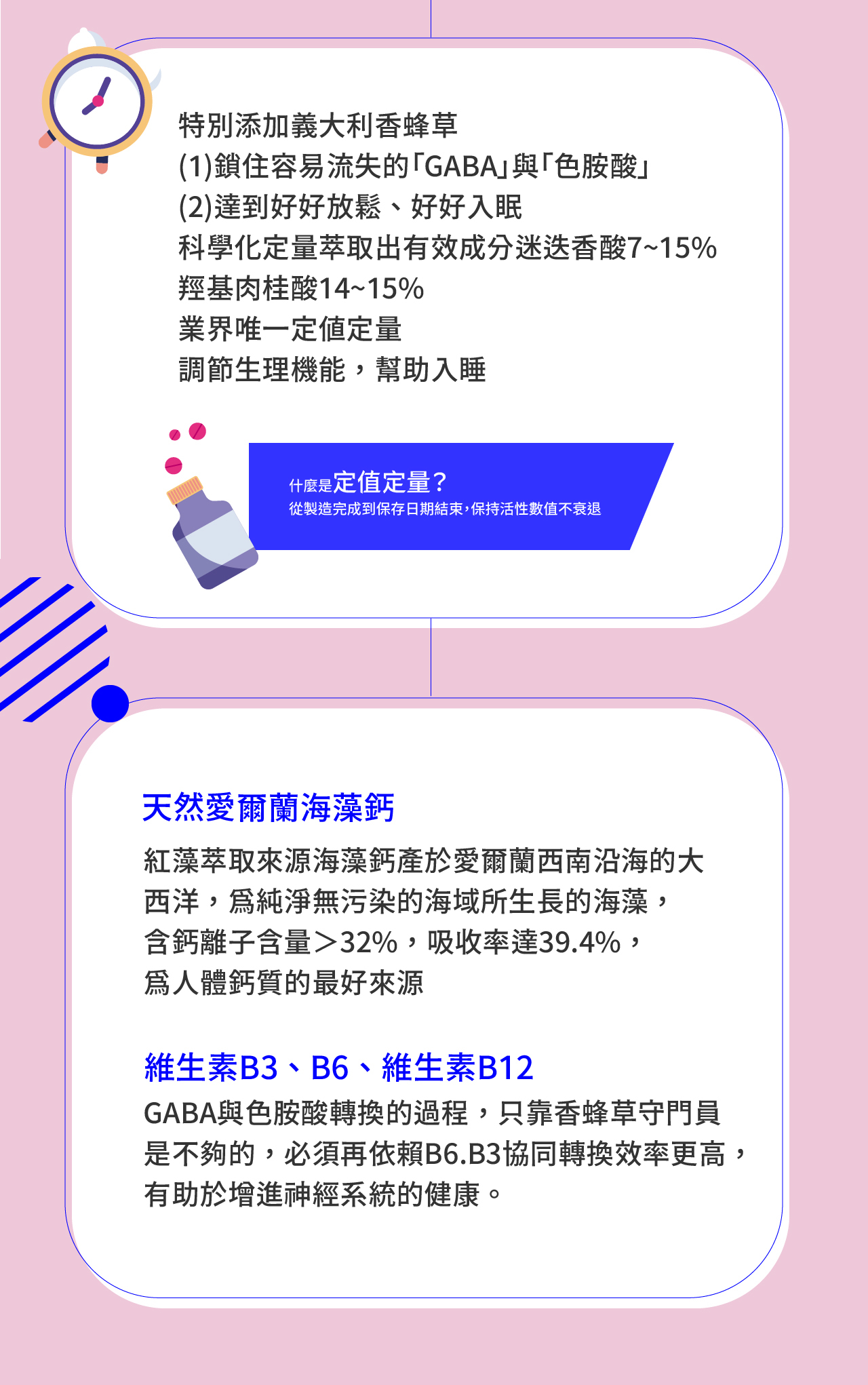 「幫助入睡」特別添加紅藻海藻鈣,達到睡前放鬆的作用,就和上述的道理一樣。