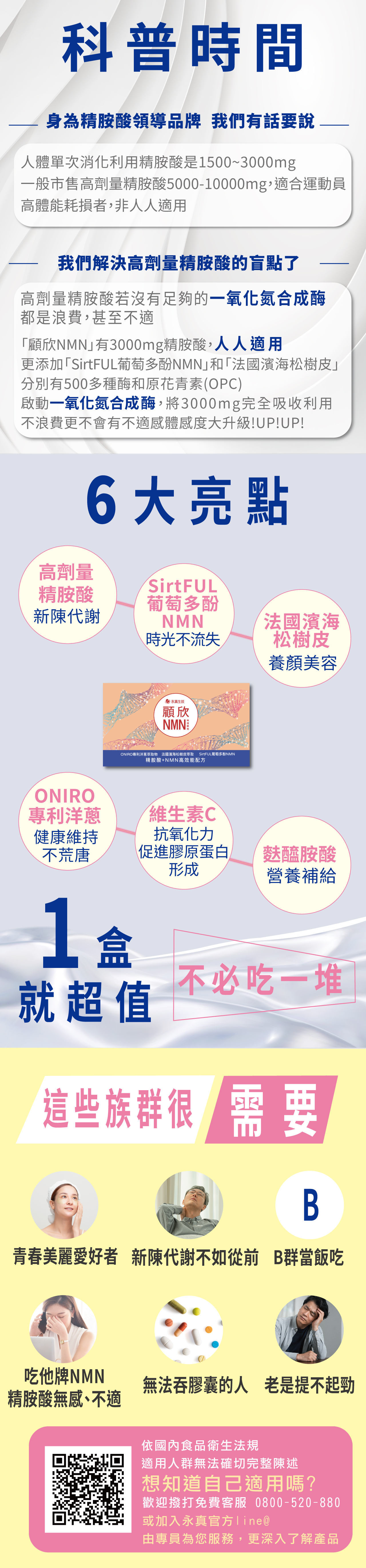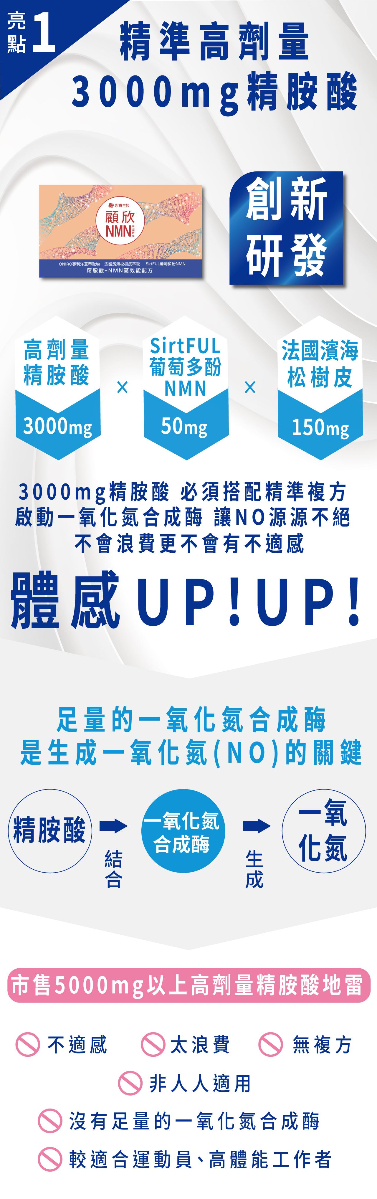 A:【 高劑量精胺酸-3000mg】搭配精準複方,啟動一氧化氮合成酶,使一氧化氮源源不絕