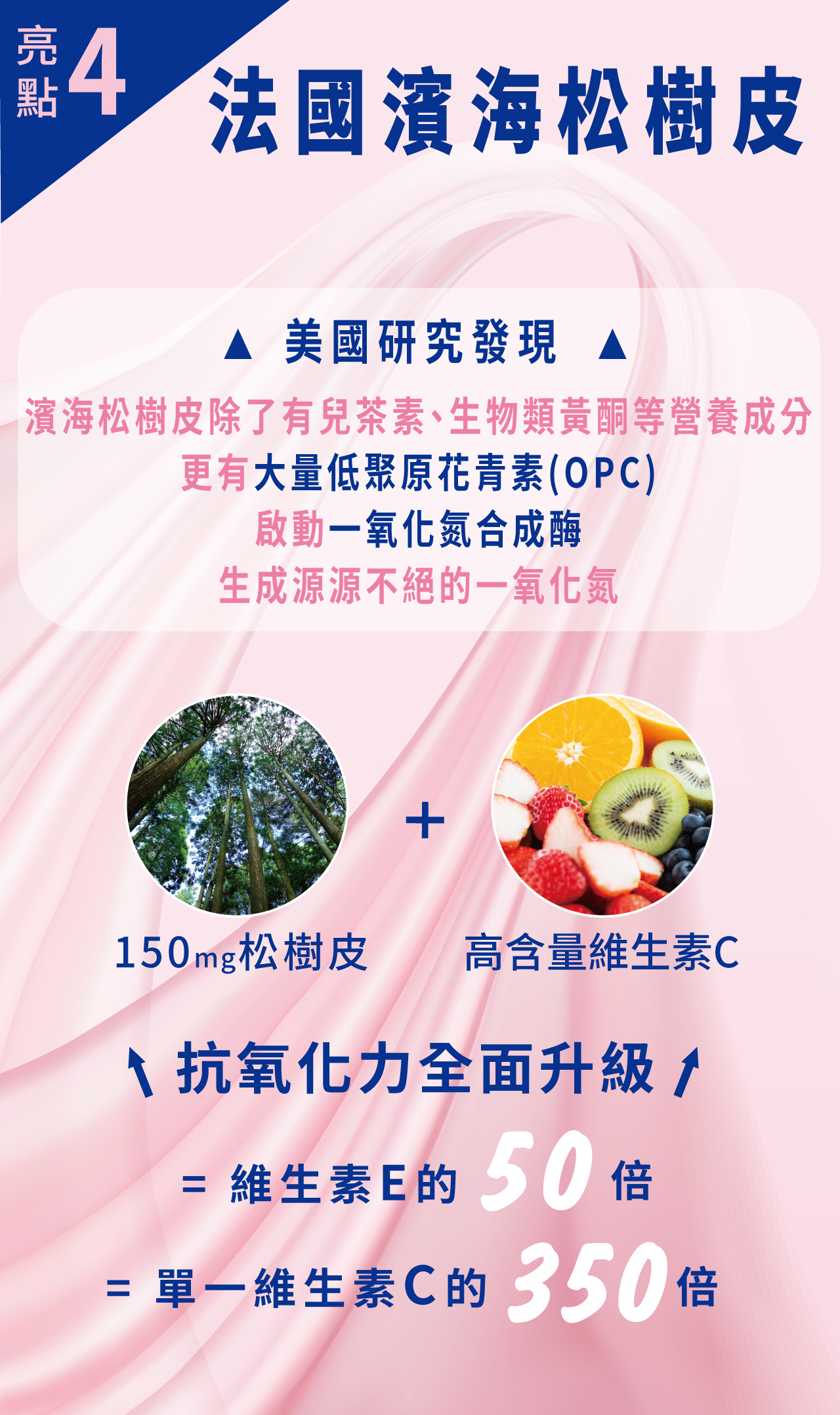 【法國濱海松樹皮-150mg】:含原花青素(opc),搭配維生素C,抗氧化力再升級